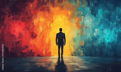 silhouette, man, abstract, background, colours, vibrant, art, standing, figure, contrast, emotional, expression, creativity, modern, design, illustration, digital artwork, solitude, contemplation, inspiration, artistic, colourful, visual, portrait, human, shadow, light, darkness, mood, psychology, symbolism, beauty, elegance, style, contemporary, artwork, imagination, scene, environment, atmosphere