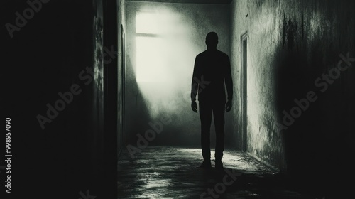 silhouette, man, standing, hallway, dark, light, end, source, room, wall, door, window, shadow, dust, dirt, grunge, creepy, mysterious, skittish, abandoned, forgotten, eerie, atmosphere, mood, contrast, grey, black, white, floor, texture, abstract, photo, art, image, graphic, design