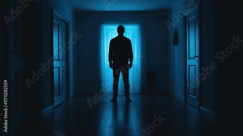 man, silhouette, hallway, door, dark, blue, light, room, interior, night, shadow, mystery, alone, figure, person, standing, home, house, corridor, entrance, space, mysterious, suspense, lonely, isolated, back, illuminated, glow, floor, wall, perspective, background, image, photo, picture, design, graphic, art, illustration, concept, abstract, mood, feeling, emotion, dramatic, tense, eerie