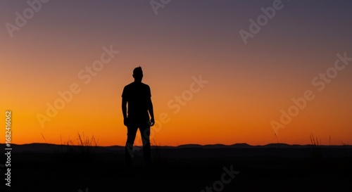 man, silhouette, sunset, twilight, light, sky, orange, purple, dusk, horizon, landscape, nature, evening, scenery, atmospheric, dark, people, human, standing, solitary, figure, outline, shape, form, person, male