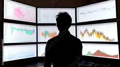 Silhouette of a Person Analyzing Multiple Data Visualizations on Computer Screens