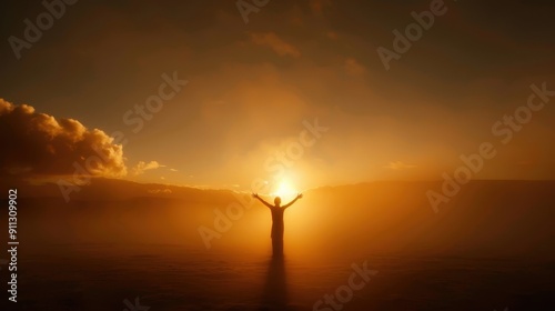 silhouette, sunset, person, gold, hours, sky, cloud, horizon, arm, outstretched, backlit, fog, mist, dawn, sunrise, landscape, nature, outdoors, warm, colours, peaceful, serene, spiritual, hope, joy, optimism, dreamy, inspirational, dramatic, beautiful, light, ray, of, soft, photo, photo, image, digital, art, creative, visual, artwork