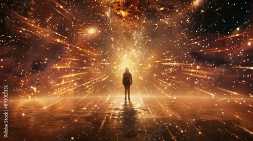 silhouette, person, cosmic, scene, gold, orange, light, star, space, galaxy, universe, night, sky, astronomy, astrophotography, celestial, bright, sparkle, twinkle, glistering, glow, radiant, aglow, mystical, dreamy, abstract, surreal, fantasy, dark, background, alone, solitude, standing, figure, horizon, future, mystery, journey, destination