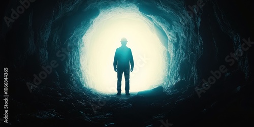 Silhouette of a person standing in a dark tunnel with bright light at the end.