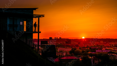 Silhouette of a person watching deep orange sunset over the city