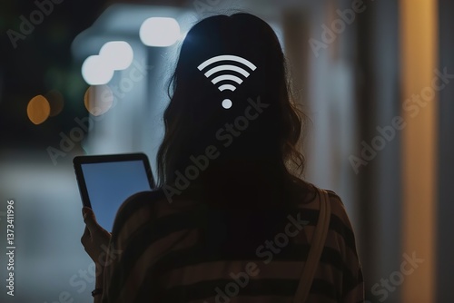 Silhouette of a person with a Wi-Fi symbol and tablet at night
