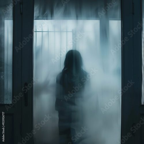Silhouette of a woman behind a foggy glass door with condensation and water droplets, creating a mysterious and moody atmosphere with soft ethereal lighting, evoking introspection and solitude