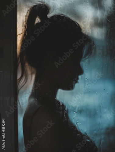 Silhouette of a woman behind a foggy glass door with condensation and water droplets, creating a mysterious and moody atmosphere with soft ethereal lighting, evoking introspection and solitude