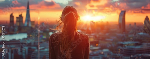 Silhouette of a woman gazing at a glowing city skyline during a picturesque sunset. Free copy space for text.