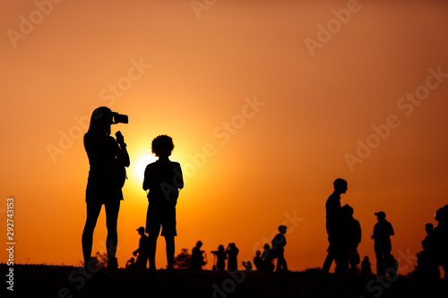 silhouette of a woman holding a smartphone taking pictures with child and crowd people outside during sunset