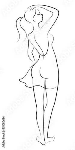 Silhouette of a woman in a modern continuous line style. The girl is slim and beautiful. Lady suitable for aesthetic decor, posters, stickers, logo. Vector illustration.