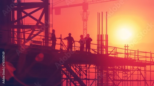 Silhouette of an engineer and construction crew working team discussing blueprints at sunrise.