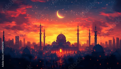 Silhouette of an Islamic Arab city. Middle east. Religious monuments and minarets with domes. Sunset view. 3d render.