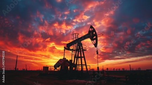 Silhouette of an oil pump jack against a vibrant sunset sky filled with dramatic clouds The scene captures the essence of energy production