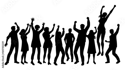 silhouette, crowd, celebrate, success, achievement, vector, illustration, concept, graphic, design, web, people, group, party, happy, joy, excitement, arm, raised, together, oneness, team, winning, victory, celebration, event, cheering, audience, performance, concert, festival, black, white, background, isolated, support, fan, community, enthusiasm, motivation