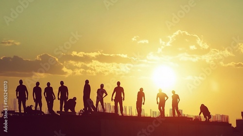 silhouette, construction, team, working, sunset, teamwork, labor, men at work, industry, people, blue skies, cloud, building, project, profession, activity, architecture, equipment, tool, management, safety-gear, collaboration, site, progress, design, landscape, evening, professionalism, effort, skill, performance, structure, oneness, craftsmanship, commitment, construction site, sun, horizon, scene, atmospheric, sunlight