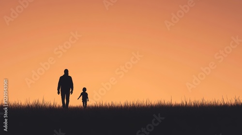 sunset, silhouette, father, children, son, daughter, family, walking, grass, field, meadow, orange, sky, horizon, dusk, evening, together, love, bond, care, childhood, growth, hope, future, happiness, peace, serenity, calmness, nature, outdoors, landscape, background, image, photograph, picture, illustration, vector, graphic, design, art, digital, warm, colours, light, shadow, moment, scene, life, journey