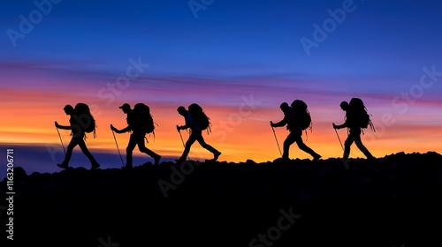 Silhouette of five hikers walking up a hill at dusk, against a blue sky with an orange and purple sunset
