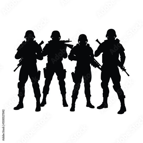 Silhouette of Four Armed Soldiers in Tactical Formation Vector Illustration