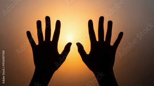 Silhouette of hands reaching toward a bright, golden sunset or sunrise, against a soft gradient