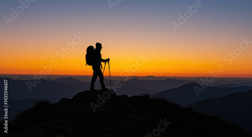 Silhouette of hiker with backpack standing on mountain summit at golden sunset. Adventure travel concept. Outdoor exploration journey. Achievement and freedom symbol. Wilderness trekking experience