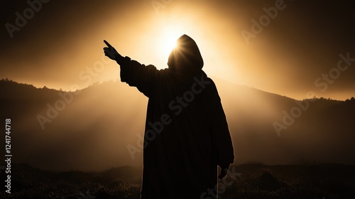 silhouette, hooded, figure, sunset, mountain, misty, cloaked, pointing, gesture, shadow, light, atmospheric, mysterious, dramatic, early morning, dawn, twilight, backlit, halo, horizon, nature, spiritual, calmness, peaceful, solitude, wanderer, exploration, enigmatic, dusk, contemplation, journey, scenic, landscape, adventure, gold, aethereal, radiant, serene, mystical, calm, direction, vision