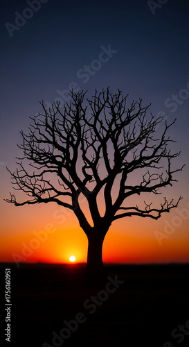 Silhouette of leafless tree against orange sunset. It represents strength through change and finding light in darkness, perfect for resilience
