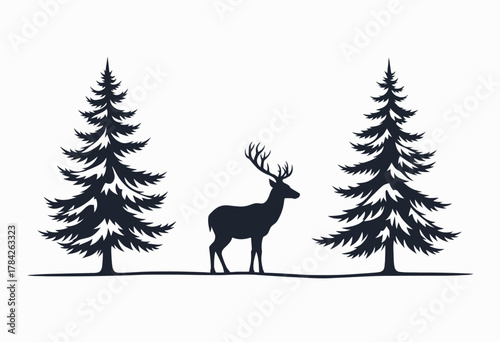 Silhouette of Majestic Deer Standing Between Two Tree Silhouettes Reflecting Wilderness and Tranquility in a Minimalistic Monochrome Design