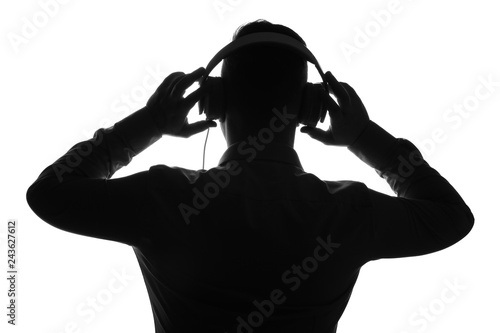 adult, back, background, black, caucasian, dark, device, enjoy, fun, earphones, hobby, isolated, leisure, lifestyle, listening, male, man, music, people, person, portrait, silhouette, sound, tone, view, white