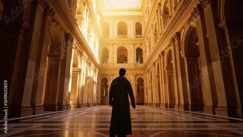 Silhouette of Man Standing in Vast Baroque Palace Hall