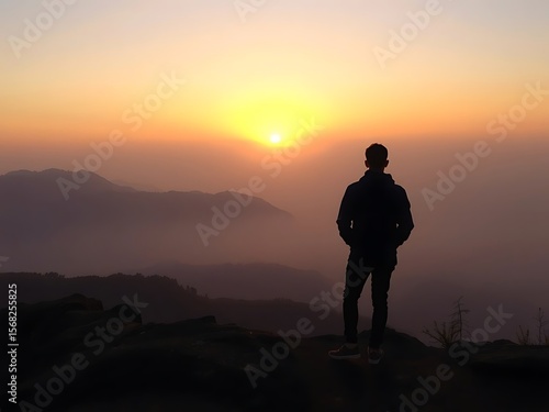 sunrise, sunset, man, silhouette, mountain, mist, fog, landscape, nature, view, scenic, golden hour, peaceful, serene, calm, tranquil, solitude, contemplation, meditation, travel, adventure, exploration, discovery, horizon, sky, cloud, hill, peak, outdoors, alone, person, backview, standing, morning, dawn