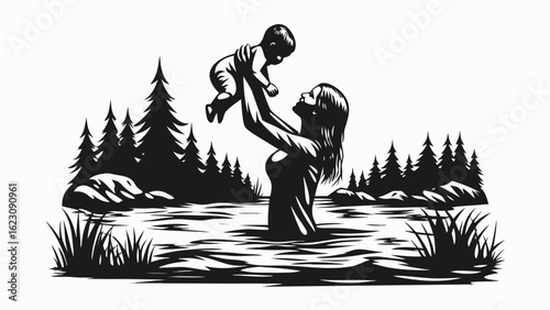 Silhouette of mother holding baby in water surrounded by trees and grass in a monochrome illustration