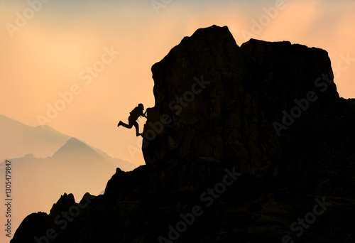 silhouette of mountain climber climbing summit rocks