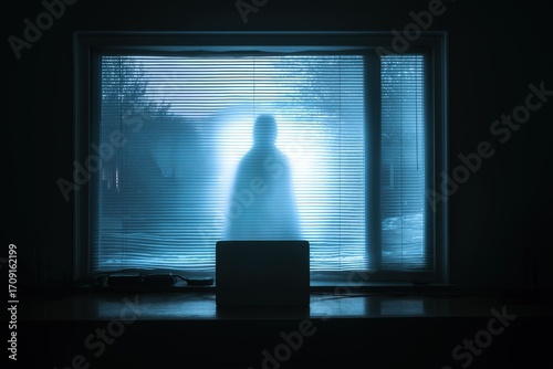 Silhouette of mysterious figure behind window with blinds in dimly lit room