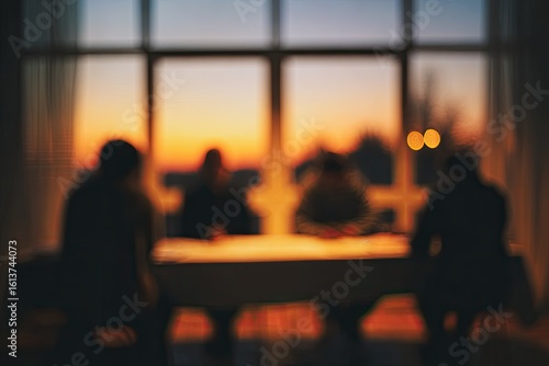 silhouette, people, table, window, sunset, blurred, orange, warm, dusk, evening, interior, room, chair, sunlight, figure, shadow, soft, sharpened, out of focus, dark, warmth, gathering, discussion, conversation, meeting, relaxation, cosy, quiet, intimate, tranquil, peace, harmony, connection, friends, family, togetherness, casual attire, lifestyle, ambience, mood, gentle, gold, evening light, natural light, warm tones, soft light, horizon