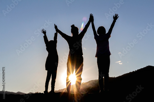 silhouette of people group with raised hands on the mountain at the sunset or sunrise time.