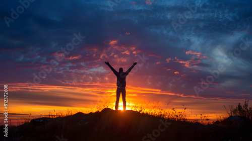 Silhouette of Person Celebrating at Sunrise on Hilltop with Scenic Sky, Embracing Nature and Triumph in Early Morning