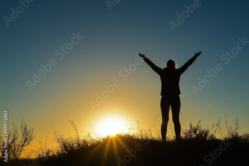 silhouette, sunset, arms raised, nature, landscape, outdoors, freedom, achievement, motivation, inspiration, peaceful, tranquil, serene, scenic, beautiful, sky, horizon, tree, grass, person, human, figure, shadow, backlit, dramatic