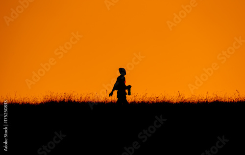 Silhouette of photographer walking top of mountain at sunset time.Sky background.