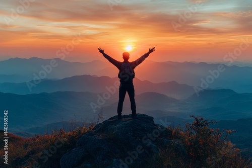 Silhouette of positive man on mountain top, with arms raised up, silhouette of man standing on the hill, Business, success,victory,leadership,achievement concept. Freedom travel