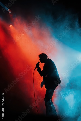 singer, silhouette, stage, performance, music, concert, microphone, light, smoke, entertainment, artist, musician, band, rock, pop, show, spotlight, dark, shadow, red, blue, musical, event, live, performer, vocalist, singing, audience, crowd