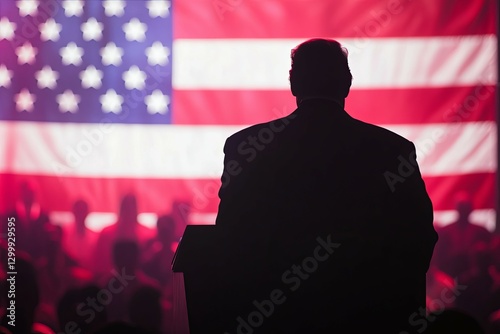 silhouette, speaker, dais, american, flag, patriotic, political, dramatic, lighting, composition, gravity, anticipation, image, photo, visual, red, white, blue, star, stripes, crowd, audience, event, speech, address, powerful, intense, serious, backlit, shadow, figure, nationalism, election, politic, campaign, convention, rally, leadership, authority, prestige, power, marketing