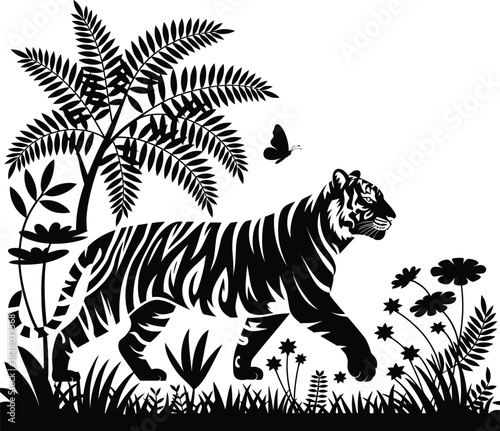 tiger, silhouette, jungle, animal, wildlife, nature, wild, cat, black, illustration, vector, design, graphic, palm tree, tree, flower, plant, tropical, butterfly, grass, mammal, forest, environment, flora, fauna, pattern, stripes, decorative, isolated, element, botanical, stalking, felino, carnivore, asian, bengal, predator, zoo, drawing, artwork, background, clip art, symbol, tattoo, conservation, landscape, herb, leaf