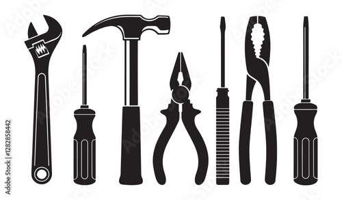 tool, hammer, wrench, tool, screwdriver, plier, work, equipment, isolated, set, spanner, construction, metal, old, screw, repair, vector, white, steel, hardware, icon, object, saw, handle, toolbox