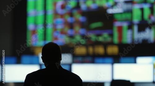 silhouette, trader, financial, datum, monitor, stock exchange, technology, analysis, investment, man, adult, screen, display, computer, dashboard, chart, graph, office, workspace, electronic, hardware, finance, economy, success, strategy, business, future, global, intelligence, risk, opportunity, foresight, dark, blue, green, bokeh, blur, cinematic, backview, backview, copy space, professional