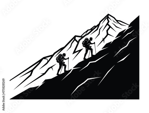 Silhouette of two hikers climbing a mountain, adventure and determination in a monochrome