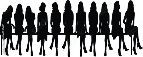 Silhouette of women, sitting in row, fashionable outfits, high heels, elegant poses, stylish, chic, trendy, black and white, group, fashion concept, modern elegance, feminine style, graceful posture,