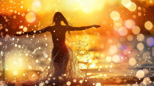 Silhouette of young woman in sea, sunset light, magic golden glitter