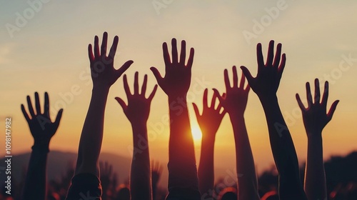 silhouette, raised, hand, celebration, solidarity, crowd, gathering, oneness, support, sunset, sky, light, evening, daylight, nature, joy, freedom, community, togetherness, upward, background, warmth, horizon, landscape, people, group, raise, gesture, atmosphere, spiritual, environment, moment, peace, contrast, colourful
