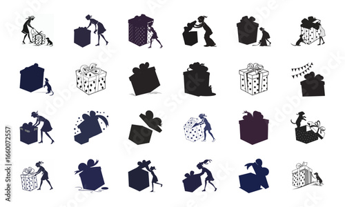 Silhouette Vector Illustration Set of Gift Boxes and Present Icons – Decorative Wrapped Boxes with Ribbons, Bows, People Opening Gifts, Celebration and Surprise Elements for Holiday, Birthday, and Ch